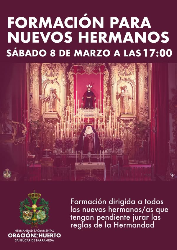 Formación para nuevos hermanos de la Oración en el Huerto Mar 8 17:00 Formación para nuevos hermanos de la Oración en el Huerto